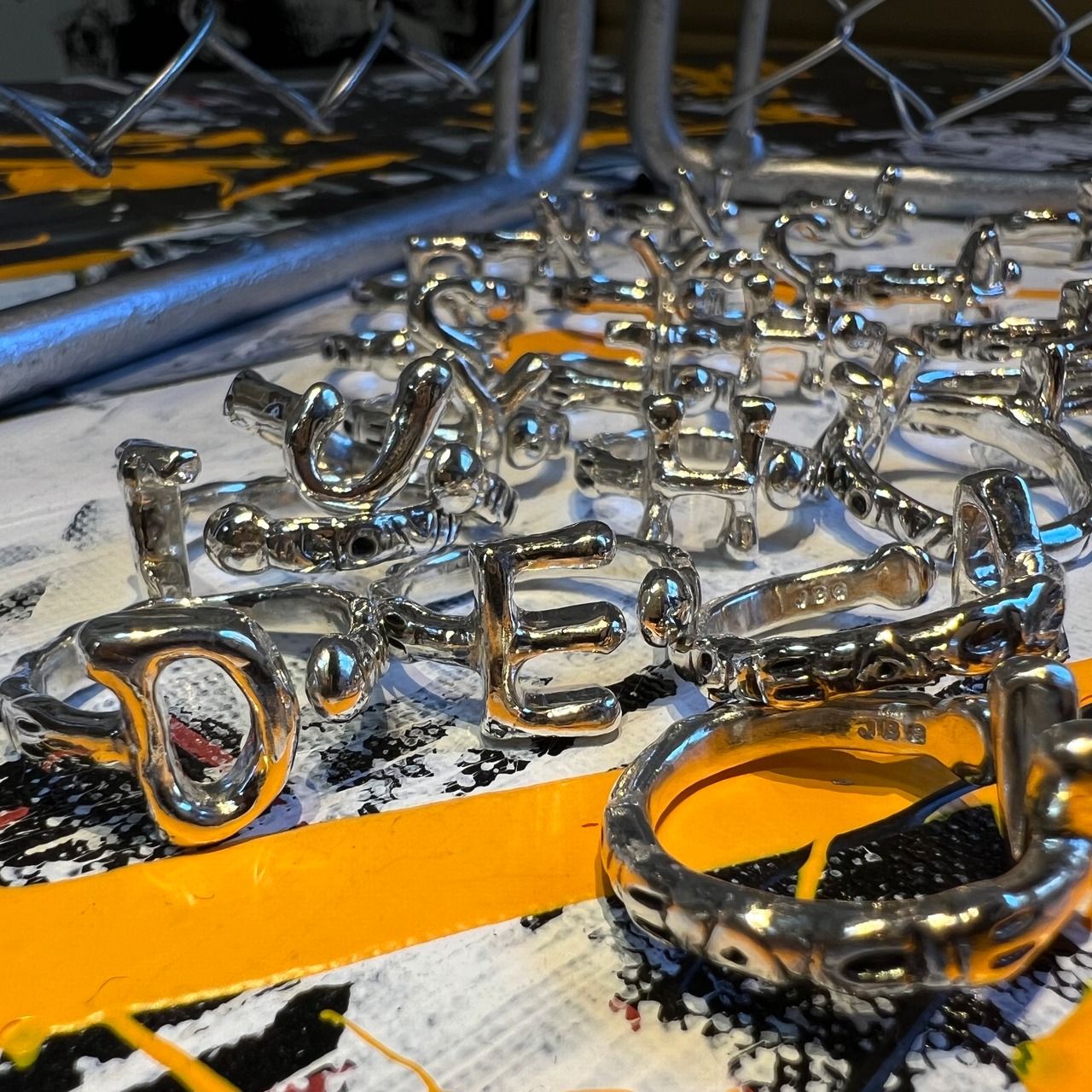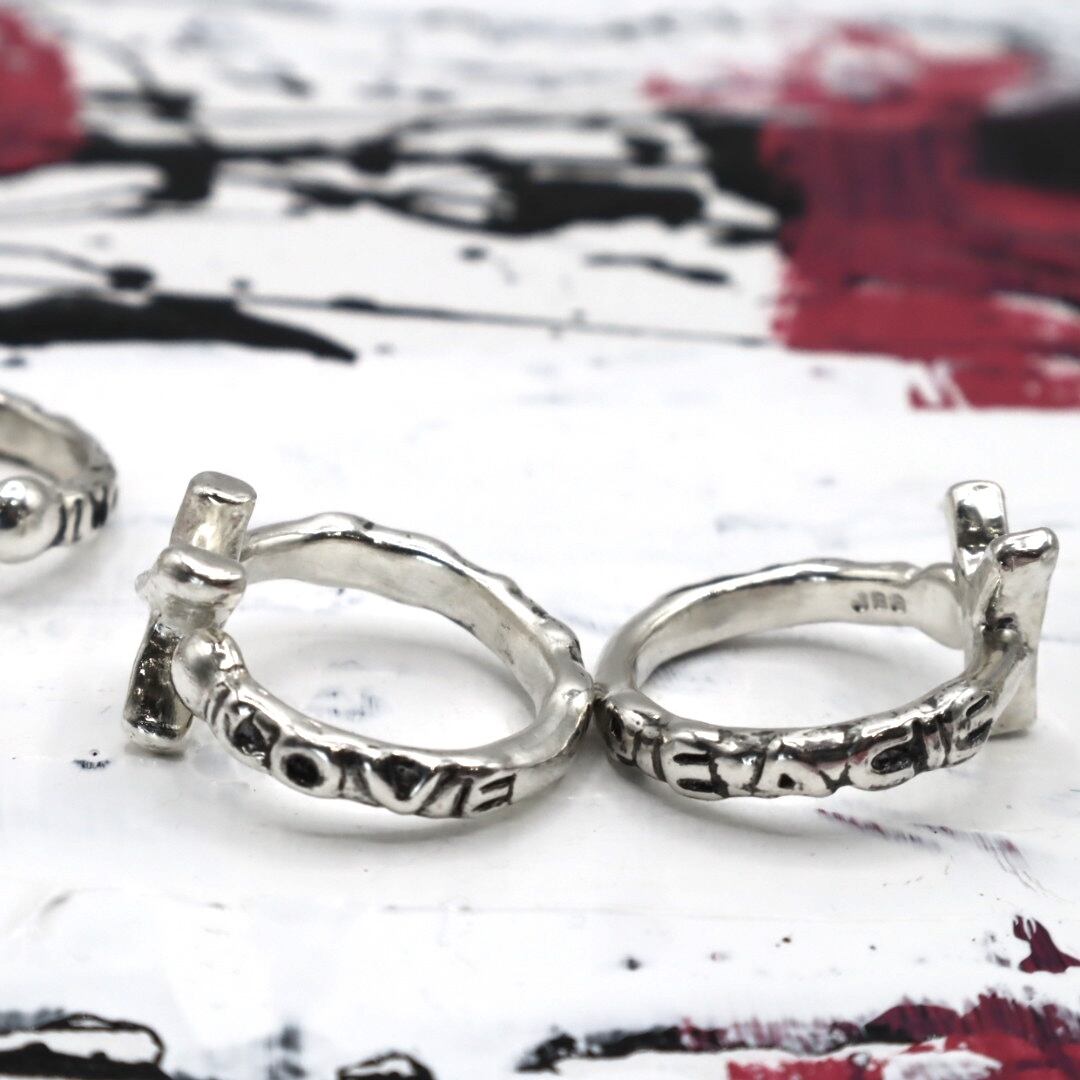 LOVE PEACE の文字が彫られたイニシャルリング